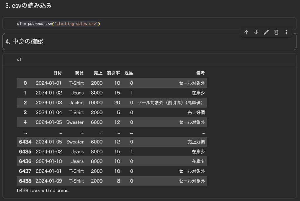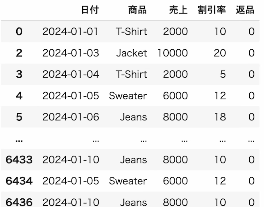 dfPythonここまでで以下のように、「備考」列と、「返品されたデータ」が削除されているかと思います。