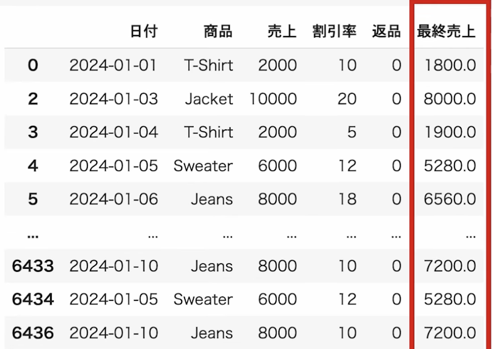 df['最終売上'] = df['売上'] * (1 - df['割引率'] / 100)