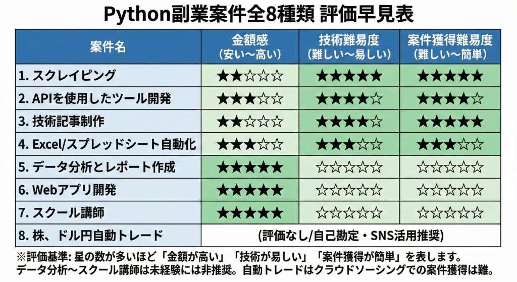 ここからは、実際に副業可能なPython案件を8つのジャンルに分け、以下の3つの指標で評価・解説します。